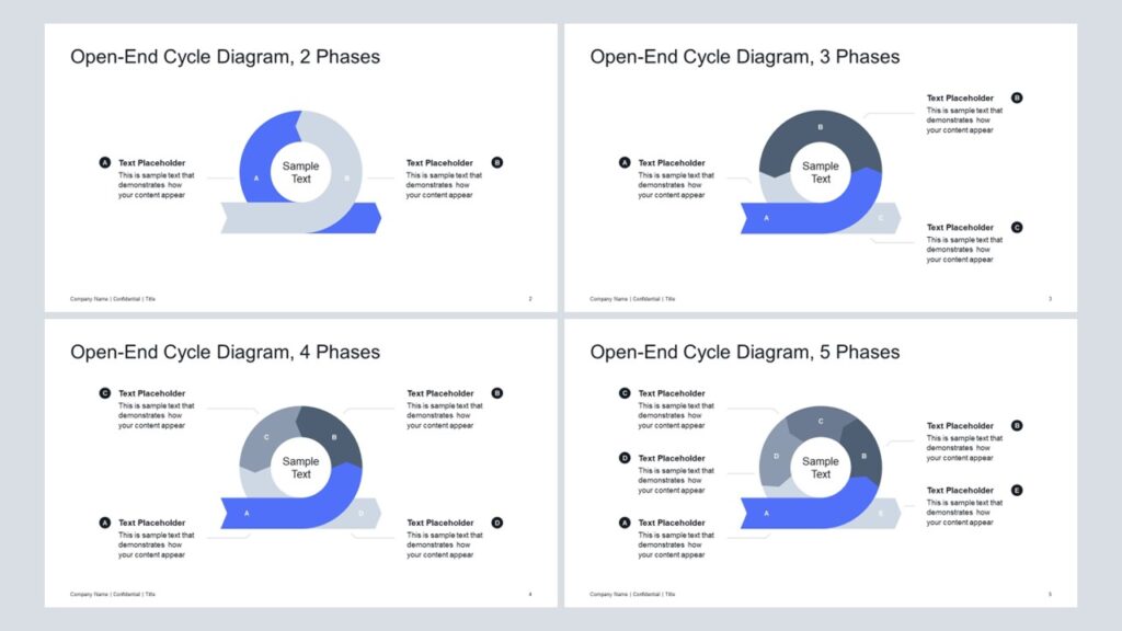 The open-end cycle diagram communicates processes that are continuous but not fully closed, making it ideal for growth, improvement, or ongoing development. It is especially well-suited for visualizing agile processes and iterative workflows where flexibility and adaptation are key.