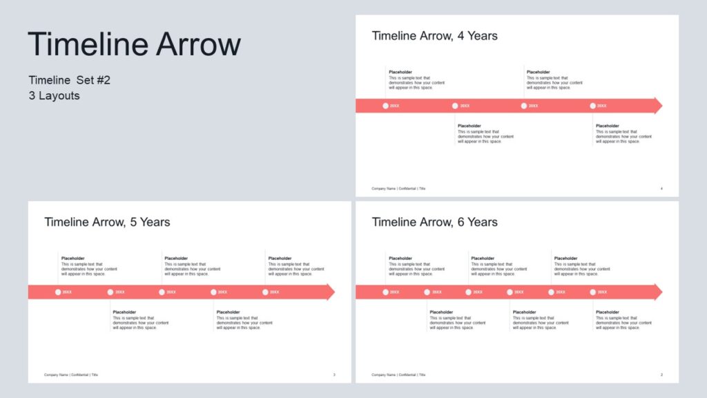 The second timeline arrow set provides flexible layouts to showcase milestones, deadlines, or process stages.
